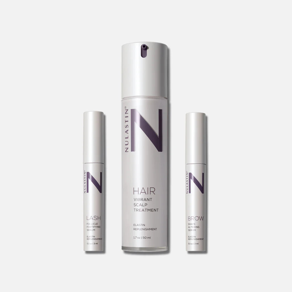 Dynamisez votre routine beauté avec ce trio primé, conçu pour soutenir le cycle de renouvellement naturel des cheveux et révéler des cheveux, des cils et des sourcils plus épais et plus fournis en seulement 6 à 12 semaines.